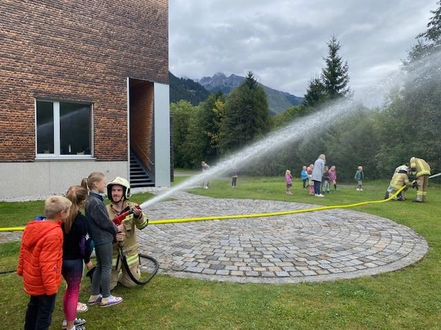Hinter der Schule durften die Kinder selber den Feuerwehrschlauch bedienen.